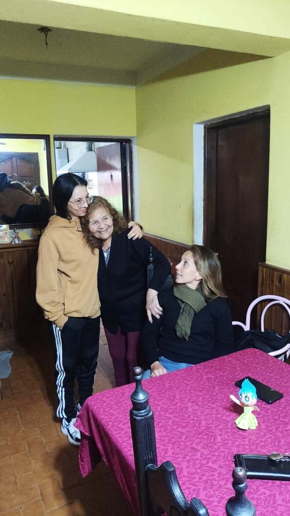 Llegamos a la casa de mamá, ella todavía en pijamas ya que era feriado en Salta, y haciendo su rutina normal con mis hermanas visitándola. Con Leon nos escondimos en la cocina. Cuando mamá entró, la sorprendimos y, por supuesto, empezaron los llantos de emoción. Los abrazos bien fuertes y la alegría de todos por estar nuevamente juntos fueron un gran momento.