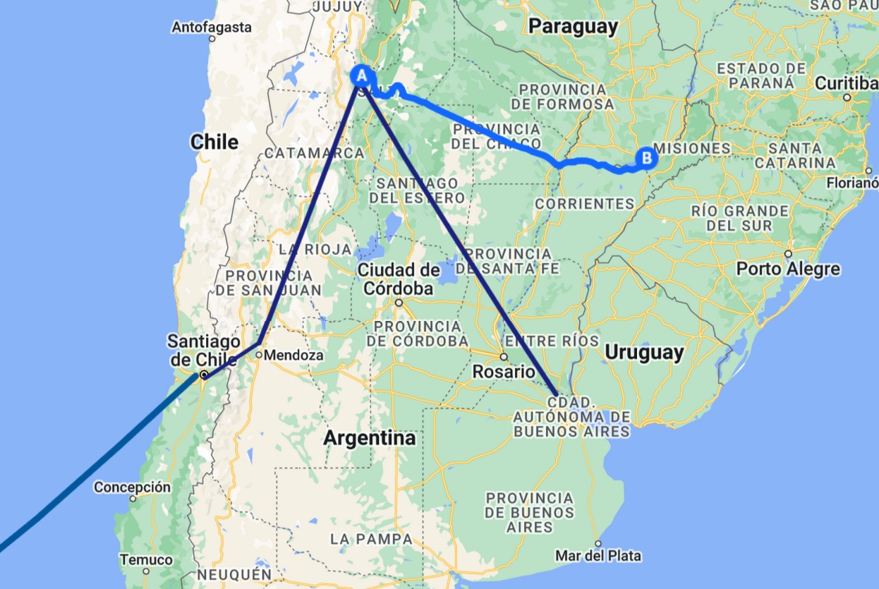 Argentina: Buenos Aires, Salta(A), Misiones(B), Mendoza, Santiago de Chile