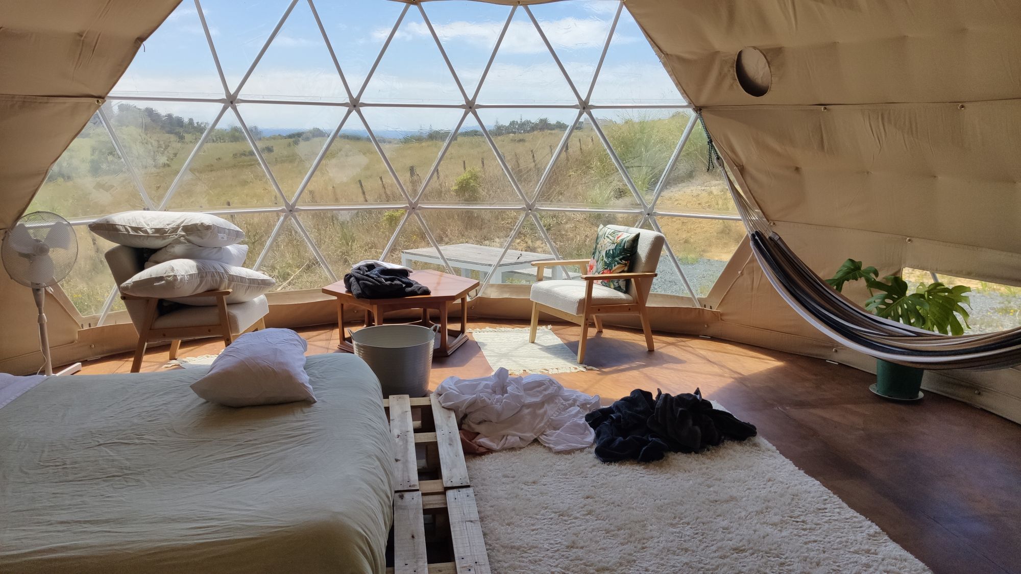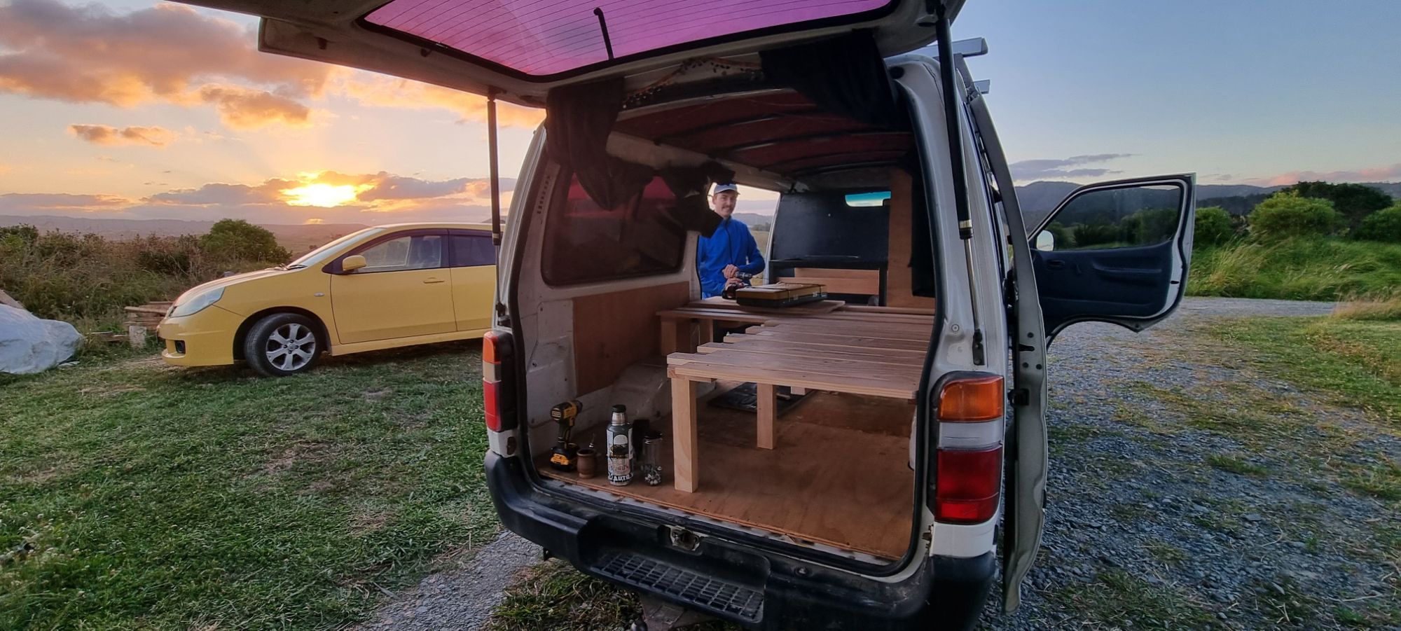Weihnachten stand kurz vor der Tür, wir hatten ungefähr fünf Wochen gearbeitet und, weil selbst die Apfelplantage Weihnachtsferien hat, suchten wir nach einer Möglichkeit eine Zeit lang möglichst kostengünstig unseren Van zu renovieren. Hier in Neuseeland ist es recht üblich sein Haus Fremden Reisenden zu überlassen, wenn man in den Urlaub fahren möchte. Das ganze nennt sich «House sitting». Das wollten wir ausprobieren und haben auch glatt eins gefunden. Zwei Stunden nördlich von Auckland, auf einem Hügel mit Blick auf das Meer und in die andere Richtung auf den Sonnenuntergang. Als Gegenleistung, um dort kostenlos wohnen zu dürfen, müssen wir uns um die Pflanzen und Permakulturbeete kümmern. Sie haben nämlich unglaublich viele Pflanzen. Außerdem müssen wir mittags zwei Zelthütten säubern und für die nächsten Gäste vorbereiten.