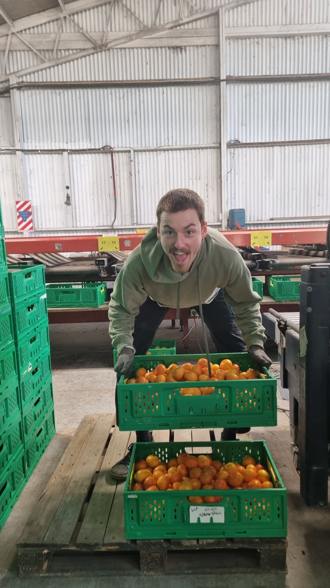 Die Früchte, die auf all den Plantagen gepflückt werden landen im nächsten Schritt in einem Packhouse. Dort werden sie dann in Qualitätsstufen unterteilt, daraufhin von einer Maschine nach Größe sortiert in kleinere 17kg – 20kg Boxen unterteilt. Diese Kisten kaufen dann Supermärkte und Fruchtsaftproduzenten oder sogar Kreuzfahrtschiffe. In dem Packhouse wo wir schließlich mit unserem Freund Diego angefangen haben war Caro dafür zuständig die ankommenden Orangen oder Mandarinen in drei Qualitätsstufen zu unterteilen. Nachdem eine Maschine die Früchte nochmals nach Gewicht und Größe musterte, waren Diego und Leon dafür zuständig die vollen Kisten Probe zu wiegen, auf Paletten zu stapeln und mit einer leeren Kiste zu ersetzen.