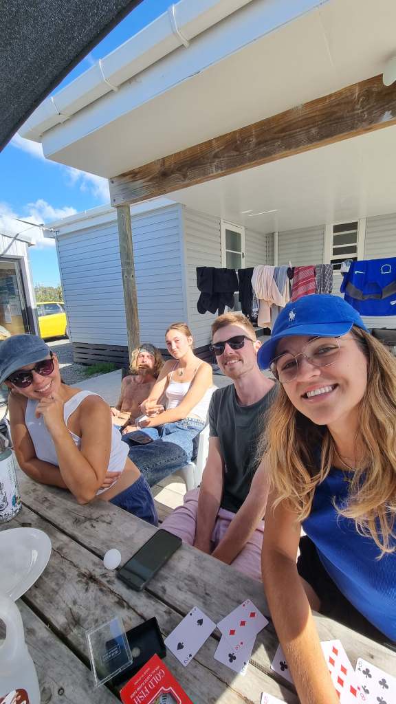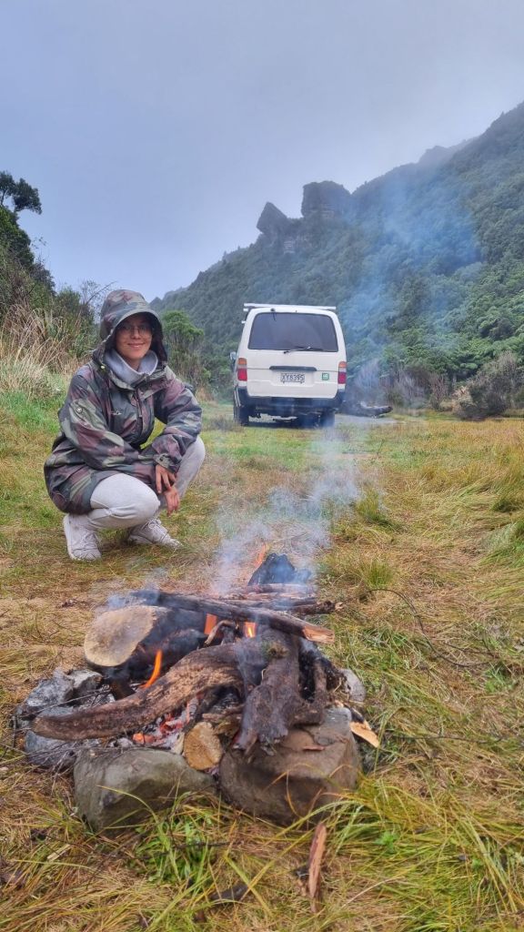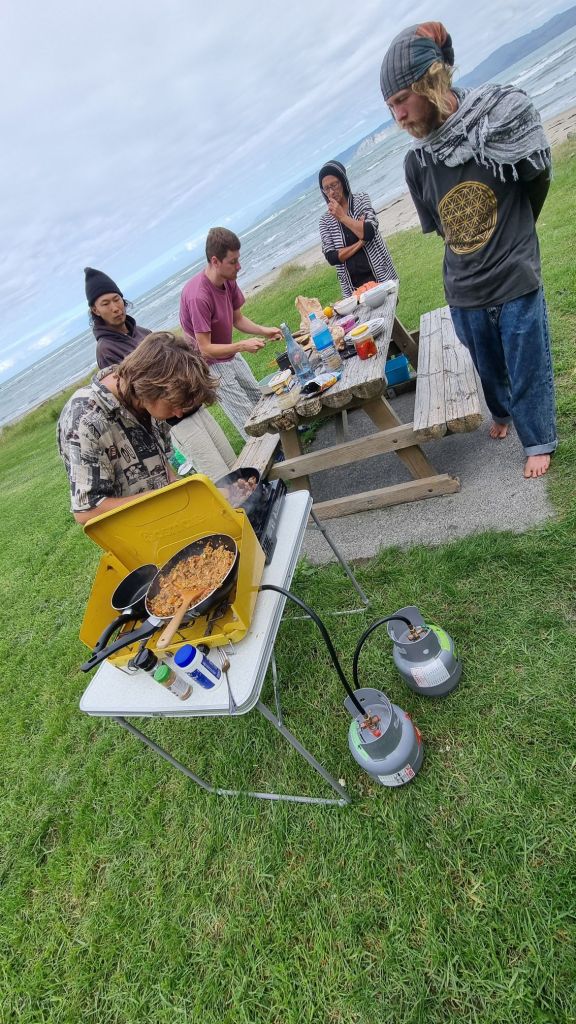 Los primeros días después de dejar Gisborne tuvimos una semana con muchísima lluvia, frío y viento. Experimentamos realmente la incomodidad de que nuestra van se moje. Pero siempre nos las ingeniábamos con rica comida calentita que cocinábamos dentro de la van y jugar a las cartas.
