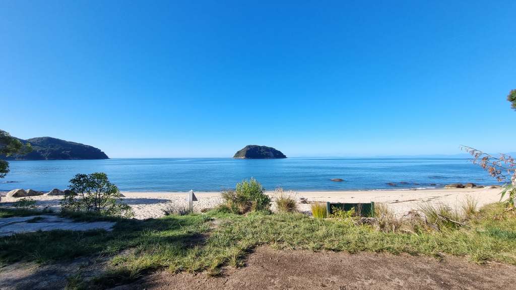 Unsere geplante Reiseroute führte uns gen Westen, wo wir uns schließlich in Motueka mit Leons Cousine Anouk trafen. Sie hatte die letzte Woche für drei Kinder und eine Mutter den Haushalt geschmissen und wollte nun wieder etwas erleben. Wir ließen uns, mit von der Familie geliehenem Equipment, auf eine dreitägige Hüttenwanderung im «Able Tasman» ein. Von einem Wassertaxi wurden wir frühmorgens in das Naturschutzgebiet an der Küste abgesetzt und starteten gemächlich in unsere erste Etappe.