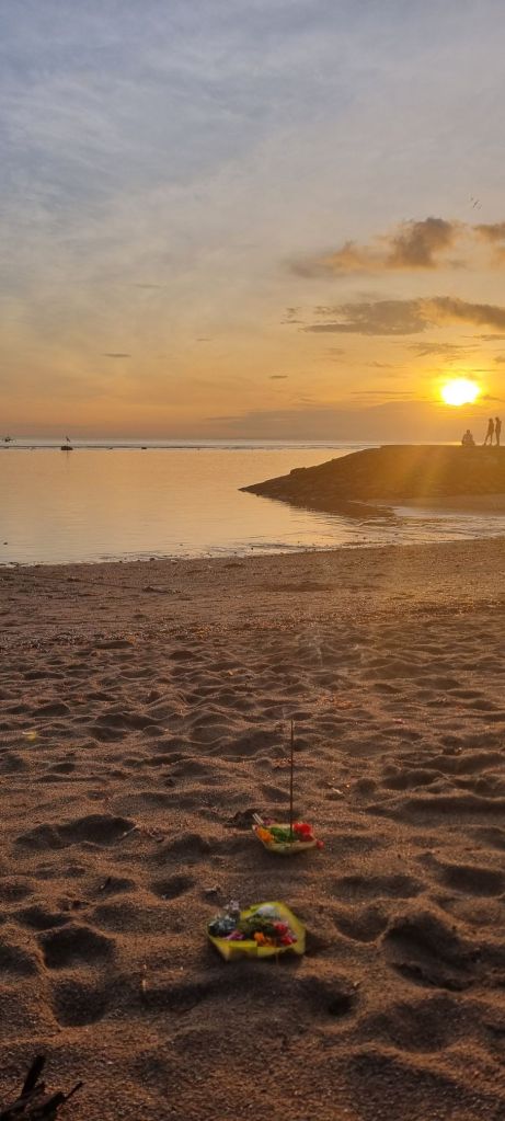 En Bali la gente deja estas ofrendas por todos lados. Son típicas estas canastillas hechas de hojas de banano con flores y sahumerios. Estas están por TODOS lados. Típicamente en las puertas de las casas, templos, negocios, en las calles e incluso en los autos.