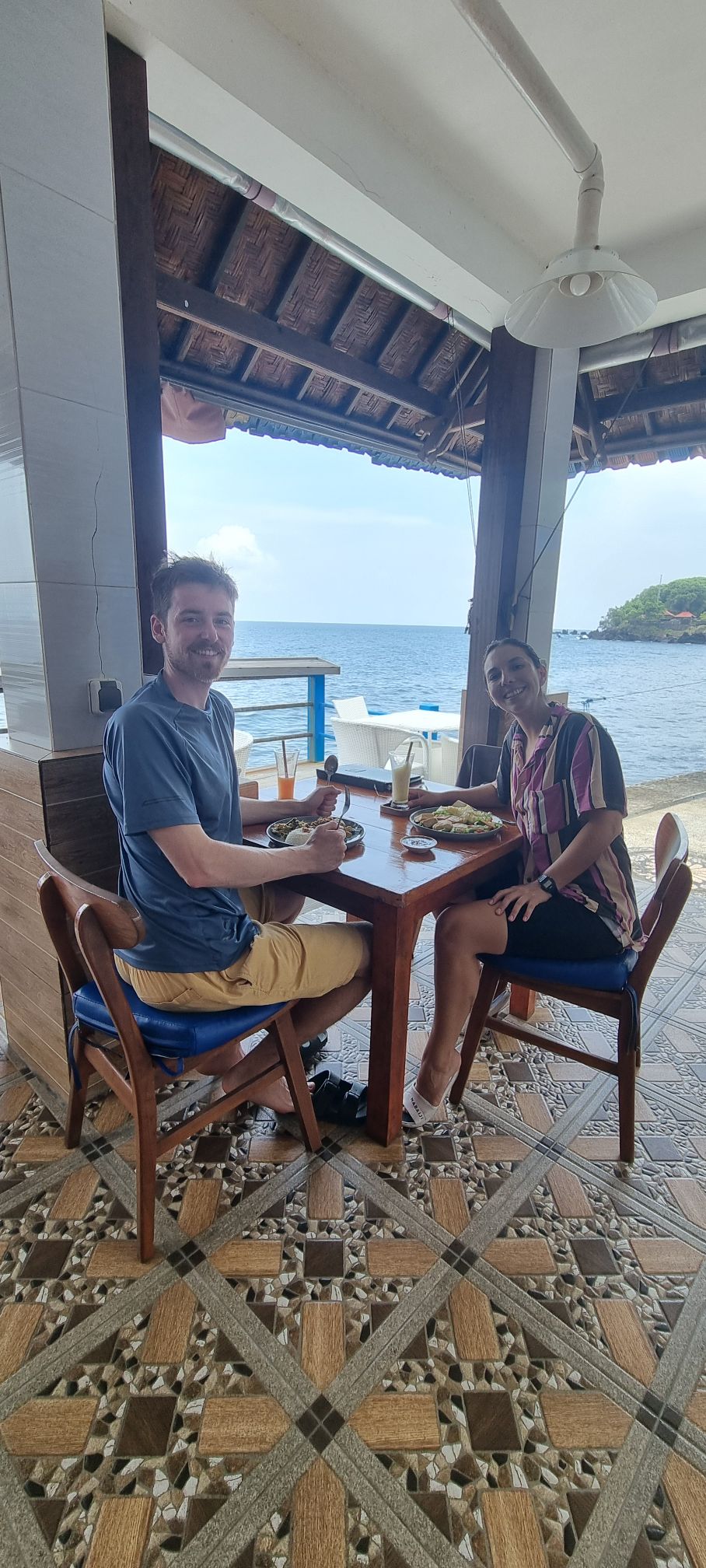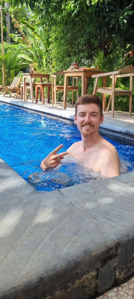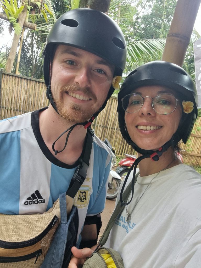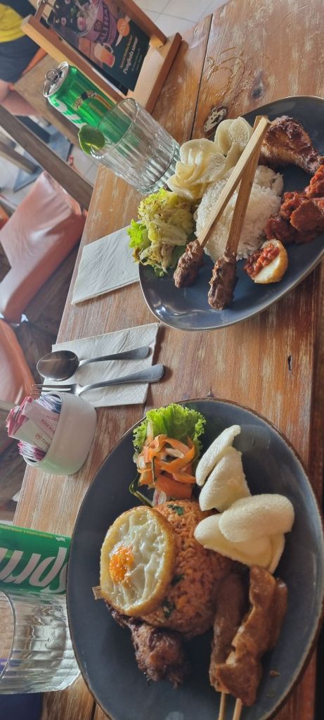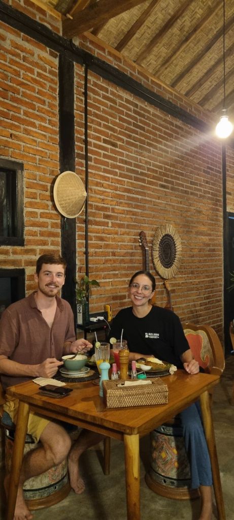 Estábamos con hambre y Leon encontró el típico «warung», que es un puesto de comida callejero. Yo estaba muy preocupada por comer algo que nos hiciera mal, pero elegimos confiar. Literal, un gecko caminaba por la minicocinita del puesto, donde solo había dos sillas para sentarse. Una madre con su hija cocinaban. Fue rico y muy barato. Por suerte no nos pasó nada y disfrutamos la experiencia.