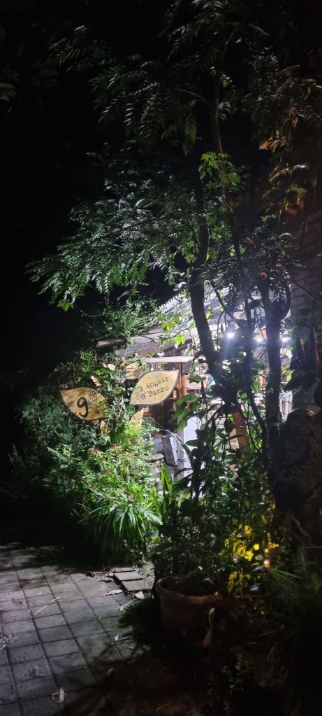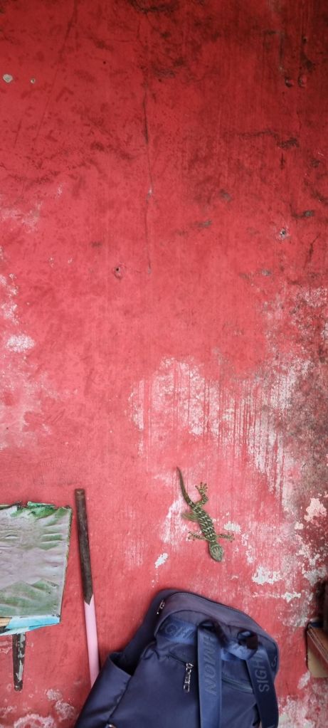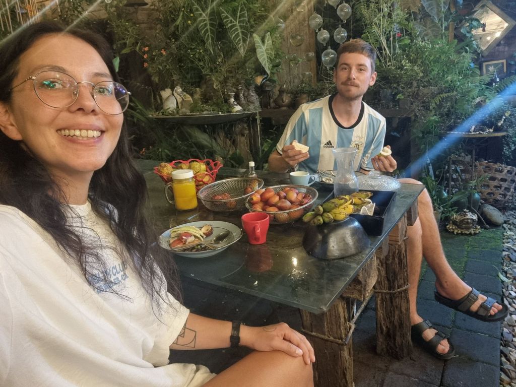 Encontramos, escondido de los turistas, un lugar para cenar en el jardín de una persona local. El cocinero y dueño cultiva todo lo que puede y cocina vegano al aire libre. Pone un precio a modo simbólico y es una comida exquisita. Aquí probamos frutas locas, té y comida muy, muy rica. El jardín es hermoso, pero así como nosotros llenamos nuestra panza, los mosquitos se llenaron con nuestra sangre jaja