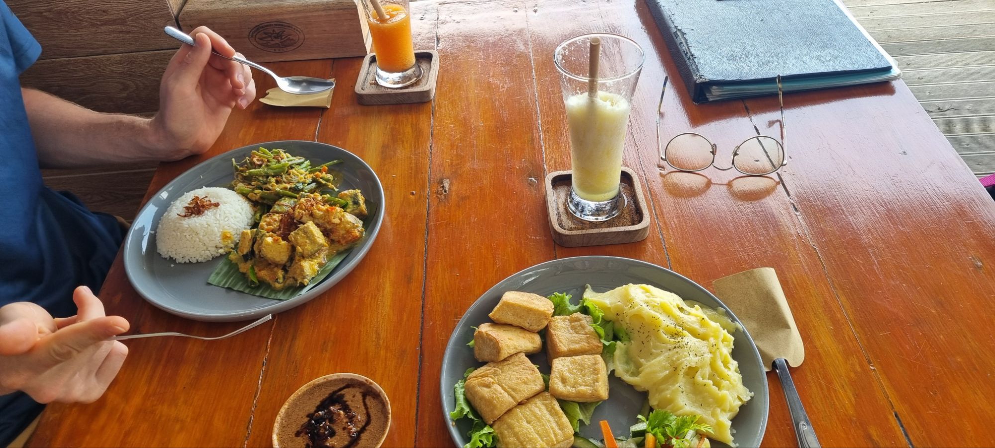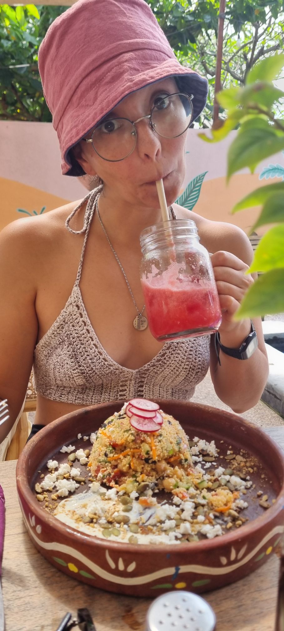 Llegamos directo a un chapuzón en el mar; lindo, aunque decepcionante. Era bastante plano y el agua estaba demasiado caliente para el calor que hacía. Pero nada que una buena comidita vegana con jugo fresco no rescate.